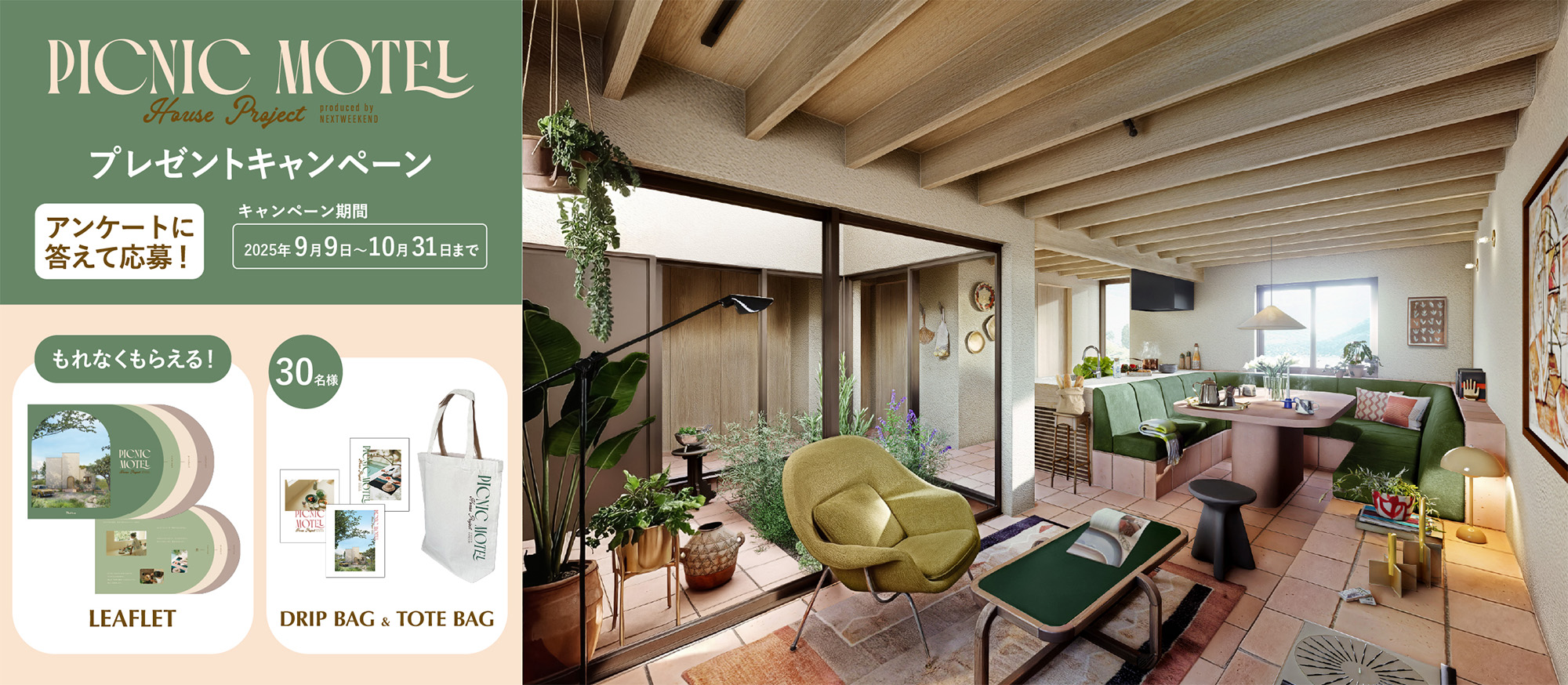 「PICNIC MOTEL House Project」のリリースを記念して、キャンペーンを実施します。本プロジェクトに関するアンケートにご協力いただいた方には、特典をご用意しています。