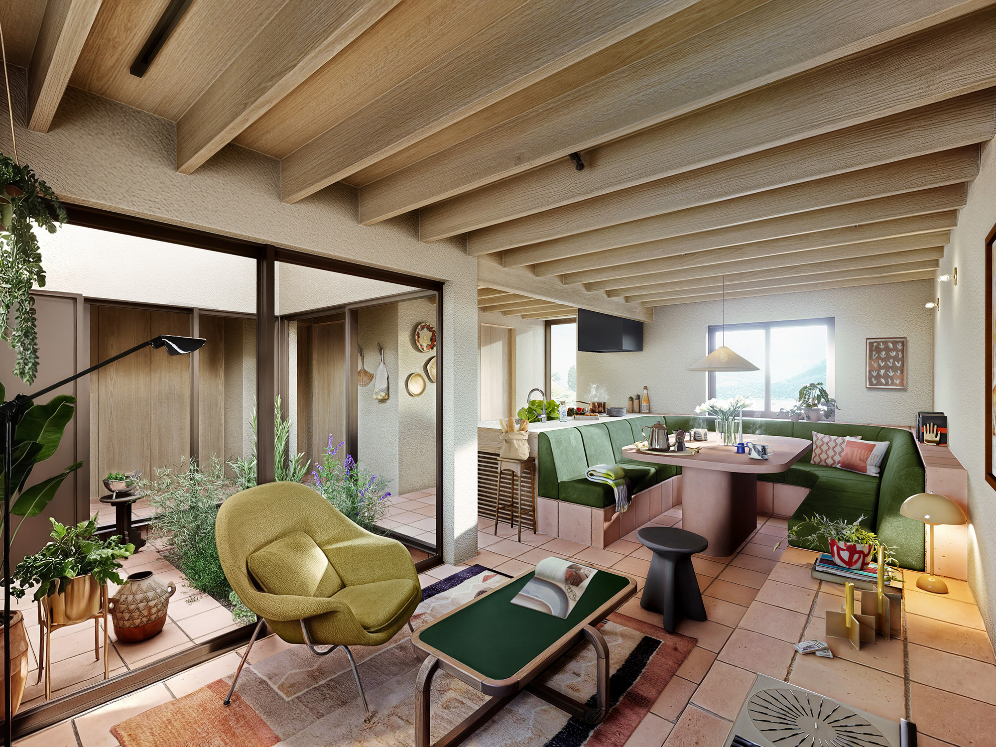 各空間イメージは「大人カラフル」なインテリアで彩り、都会的な洗練さと、旅先で出会ったような遊び心あるアートやクラフト品が似合うような空間です。