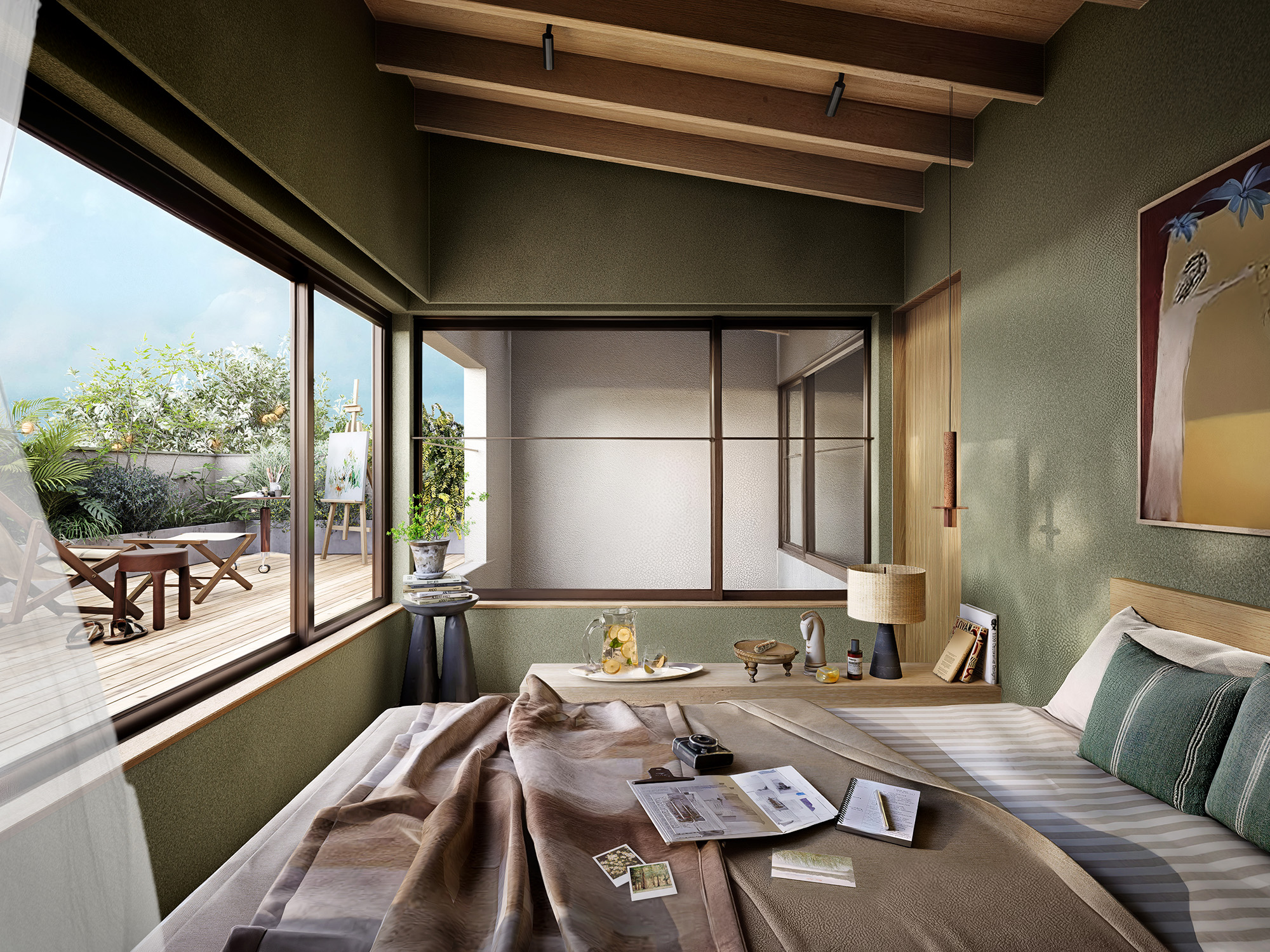 ここは、心と体を自然に切り替え、感性を整えるための空間です。やわらかなグリーンを基調とした壁と、大きく開く窓からは風と光が流れ込み、開放感をもたらします。寝室とつながるウッドデッキは、もう一つのリビングとして、読書や音楽を楽しむなど、豊かなプライベートタイムを過ごせます。